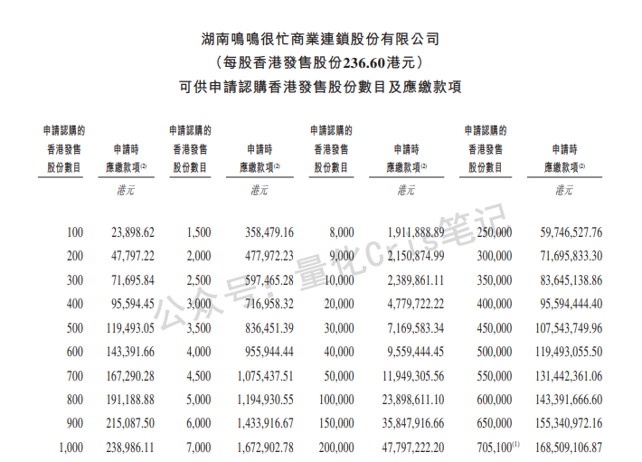 量贩零食龙头——鸣鸣很忙开启申购,机制B,公开发售比例约6.59%,全球发售约1410.11万股,招股价229.6至236.6港元,对应发行市值约491.58亿至506.56亿港元。每手100股,共约14102手,入场费约23898港元;货量极少,预计全员抽签。