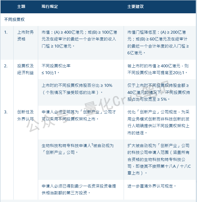 第一,同股不同权,也就是 WVR,门槛明显下调:原来无收入企业要 400 亿港元市值,拟降到 200 亿港元;原来有收入企业要 100 亿港元市值 + 最近一年 10 亿港元收入,拟降到 60 亿港元市值 + 6 亿港元收入。