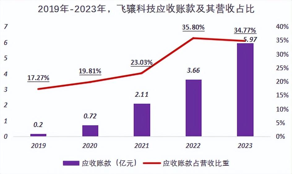 2019年-2023年,飞骧科技应收账款为2002.4万元、7225.02万元、2.11亿元、3.66亿元和5.97亿元,相应占营收比重为17.27%、19.81%、23.03%、35.8%和34.77%。