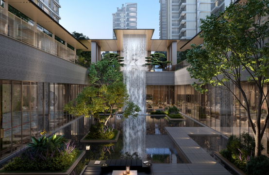 园林设计方面,源取庄子《逍遥游》中的意蕴,打造遵循三进制的中轴礼序。以乘风之翼、垂天之瀑、河汉之境、福寿之椿四个主景观为中心轴线,形成南北园区,打造玖玥十四景,尽享四季更迭之美。真正做到了一园一景一故事,回归人居本意。