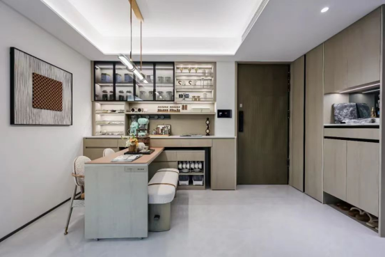 收纳痛点的解决,堪称刚需家庭的“福音”。11㎡的全屋交付收纳容积,相当于 292 个 20 英寸行李箱,这并非简单的 “堆砌空间”,而是精准匹配生活场景的系统化设计:玄关处预留了鞋柜 + 换鞋凳 + 雨伞收纳区,满足通勤出行的第一需求;厨房采用 “U 型布局”,搭配吊柜 + 地柜 + 抽屉式拉篮,让锅碗瓢盆各归其位,同时预留了冰箱、洗碗机的嵌入空间;卧室衣柜做到顶设计,避免顶部积灰,儿童房还预留了书桌与玩具收纳区,适配孩子成长后的储物需求。这种 “全场景收纳” 设计,从根源上解决了刚需家庭 “东西多、没地方放” 的居住痛点。