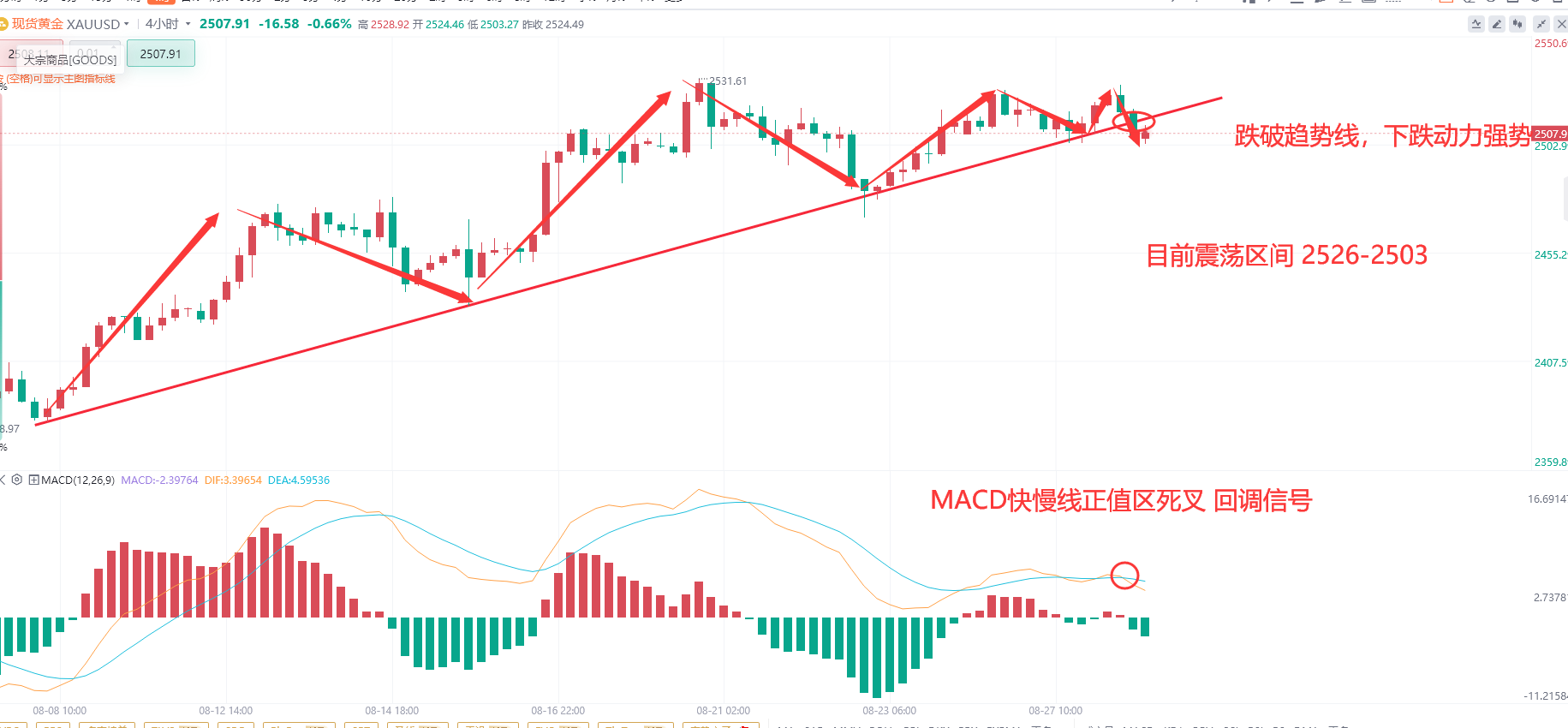 但是我没想到在今天这个震荡行情当中黄金居然直接跌破趋势线的支撑再次回到了2503的位置,所以我今天也是止损离场,那么目前黄金的震荡区间基本确定了就在2526-2503之间,这个震荡的高低点什么时候被打破就很重要,而目前随着黄金跌破趋势线的支撑,我认为目前黄金已经改变了目前的趋势,所以接下来以观望为主。
