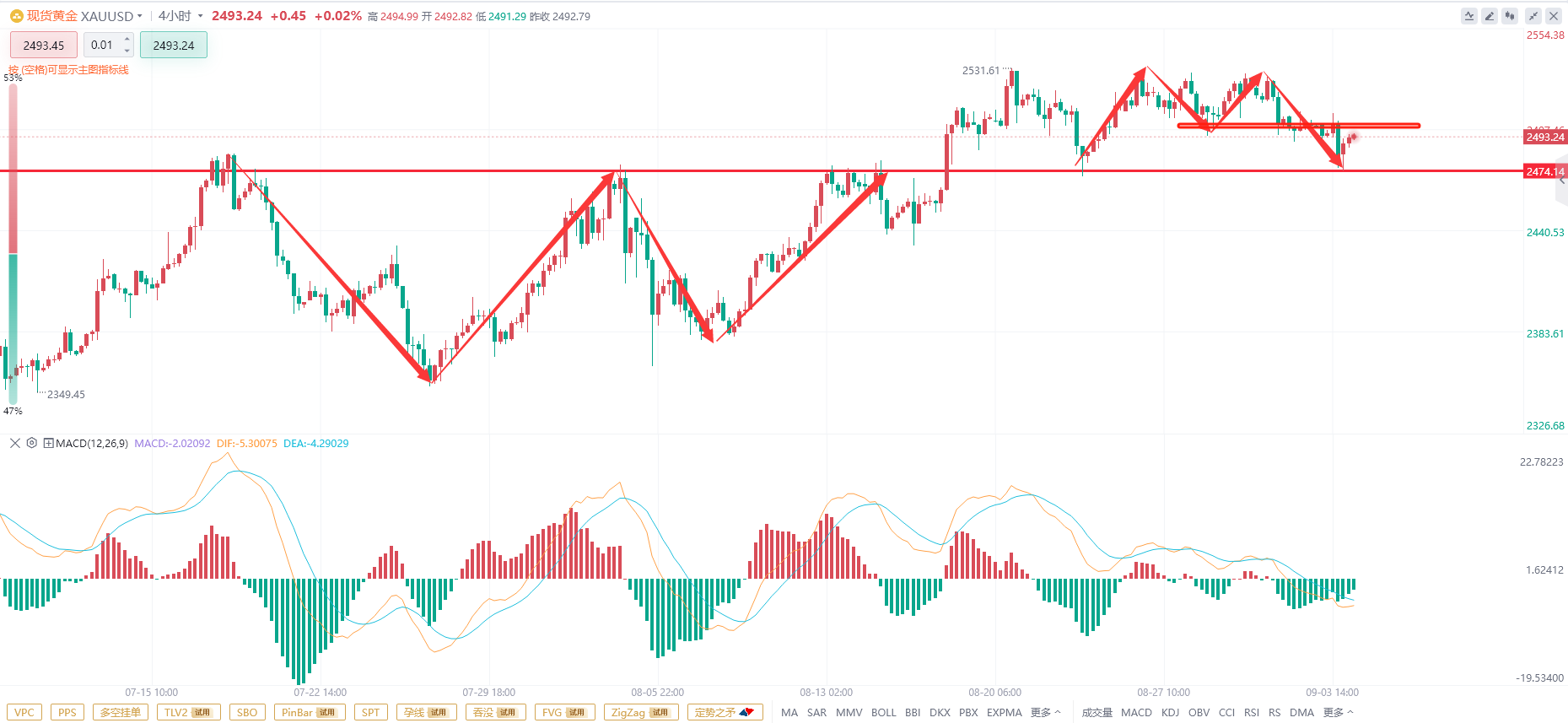 关于目前的技术面我只能说这个位置大家按照震荡来做短线就可以,目前黄金的关键位置就在2473,这个位置即是多头最后的防守也是空头第一轮的进攻点,4小时级别上方的小M顶和下方的W底形成对立,但是目前已经破位小M顶的颈线位置,接下来回抽颈线有效将会再次开启下跌,只要没有上破小M顶的颈线,这个行情就是空头强势的行情,这个行情里边尽量以空为主。