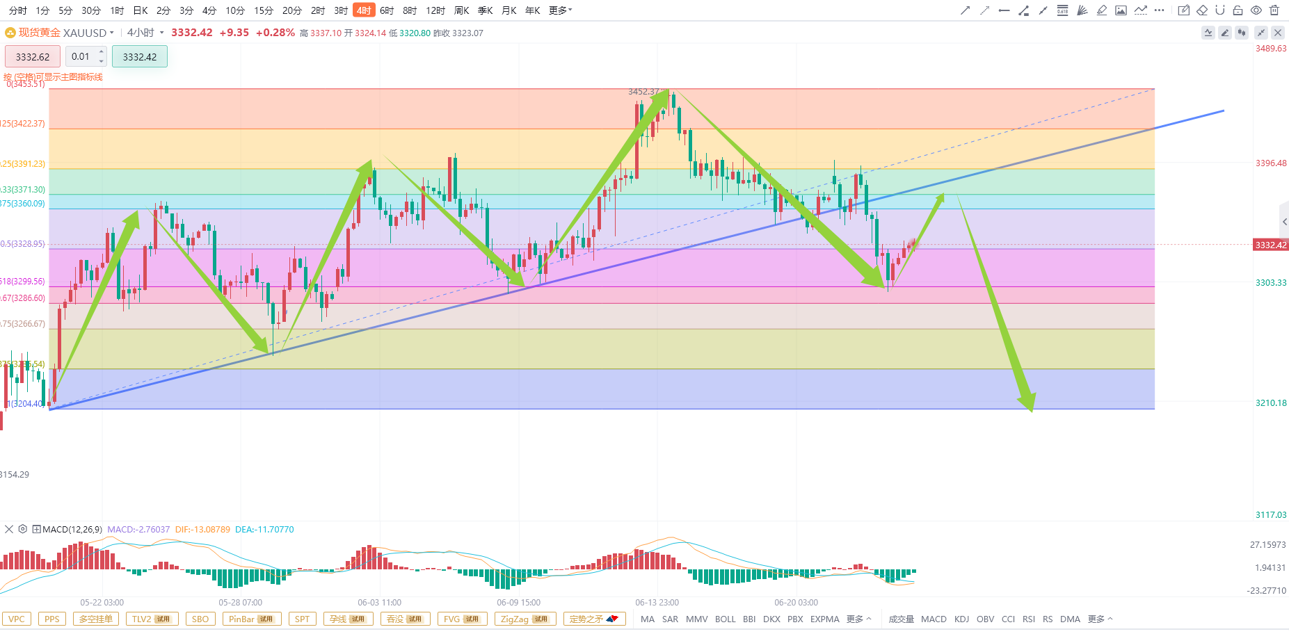 来看目前的4小时级别k线图,当前行情的上涨趋势是从3204开始上涨,一路上涨至3452形成的上涨趋势,但是在昨天已经跌破了趋势线的支撑,说明上涨趋势的结束,然后黄金开始向下回调,一路回调至这一轮上涨的关键支撑也是斐波那契的百分比0.618的关键为位置后开始上涨,并且成功突破了0.5的压制,那么说明一轮下跌的结束,那么接下来行情将会开始上涨,但是上涨趋势已经被跌破,按照道氏理论,接下来黄金大概率会去上方测试趋势线的压力,如果无法破位,则说明黄金的趋势改变,后续保持看空黄金的思路。并且当前行情MACD快慢线已经粘合,即将形成金叉的上涨信号,但是我们要注意到行情已经在零轴下方的负值区内运行,也就是从4小时级别k线图来看行情依旧是下跌趋势,所以耐心等待金价回调,下跌才是当前行情的主流趋势。