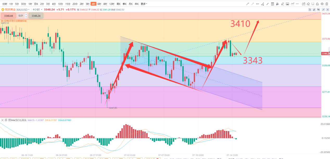 但是晚间有CPI的数据,关于CPI的数据判断昨天我在文章已经写到了,所以一旦数据上涨,金价在今天是有可能直接冲上3410-3420的区间,所以日内尽量以做多为主。