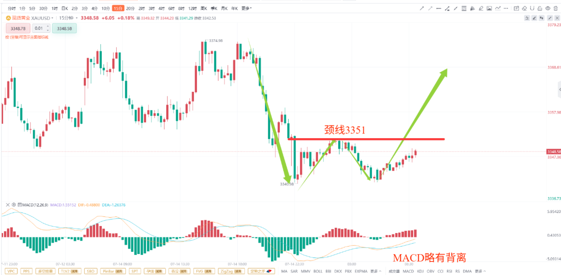 并且我发现在金价再次下跌的过程中,MACD并没有跟随下跌,那么这里也是稍微形成了底背离的走势,那么底背离加上双底的形态是非常有效的,所以今天重点关注15分钟双底的颈线位置3351,一旦突破后就可以关注上方的一倍量或者两倍量也就是3351-3340=11,3351+11=3361或者3351+22=3373的位置。
