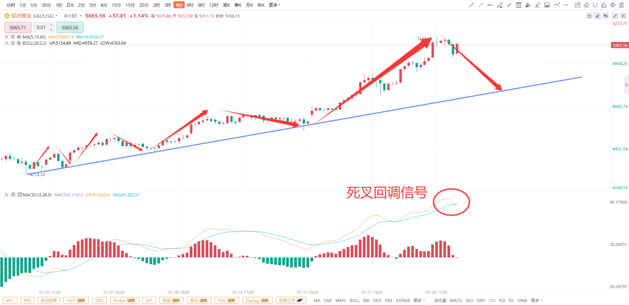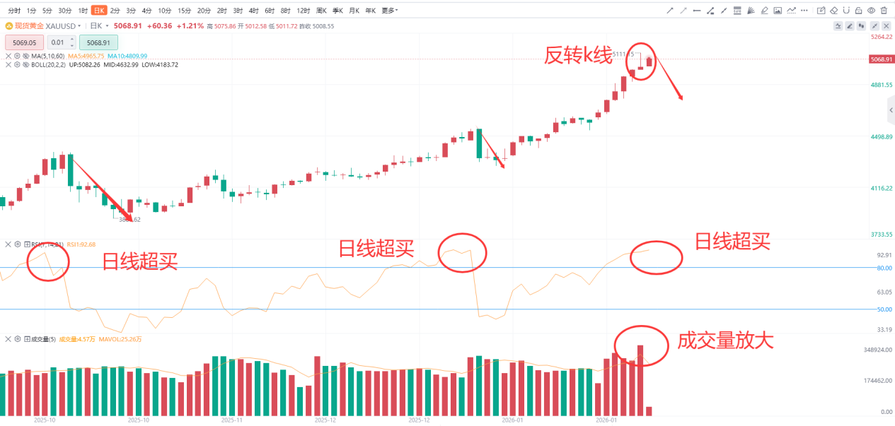 首先来看日线级别的RSI,可以从图中看到日线级别在前方出现过两次超买状态,一次是在2025年10月,随后黄金在顶部出现反转,开始了500美金的回调,第二次是在12月底再次出现超买,随后黄金出现了超300美金的回调,而目前日线级别RSI再次超买,这也是从2025年10的第三次超买,从日线的RSI来看,突破超买区就意味着黄金价格上涨过高,将会即将开启回调,所以从当前的RSI来看,目前黄金有大概率会出现回调。