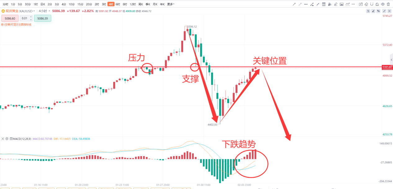 来看4小时级别k线图,目前黄金在经过一轮下跌之后开始了强势的反弹,当前已经反弹到5100附近,而5100在前方行情的上涨和下跌中都出现过有效的压力和支撑,那么在当前黄金的上涨中这个位置就是有效的压力位,后续重点需要观察k线是否能够突破当前的压力,如果不能突破行情很大概率将会再次下跌。