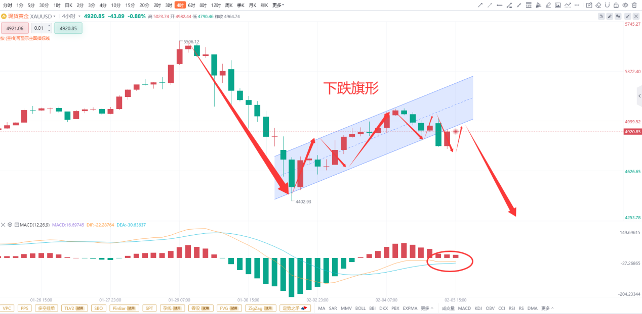 来看4小时级别k线图,目前在经过了一段下跌之后,黄金开启了短线的上涨通道,但是昨天晚上再次下跌已经跌破了通道的底部支撑,按照技术面来看,当前行情呈现下跌旗形,并且已经跌破了通道的下轨,所以很大概率将会继续下跌,目前上方的压力在通道下轨的位置,k线上行测试如果无法突破那么新一轮的下跌将会开始。