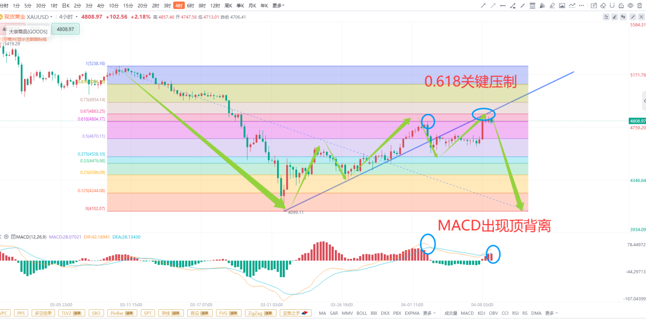 再来看MACD,在k线冲上4857的新高之后,MACD的快慢线却走出了新的波段低点,这已经形成了MACD顶背离的走势,顶背离说明当前行情的上涨是因为基本面所导致的异常上涨,导致价格已经过度买入,后续大概率将会向下修复顶背离,所以新的下跌即将开启。