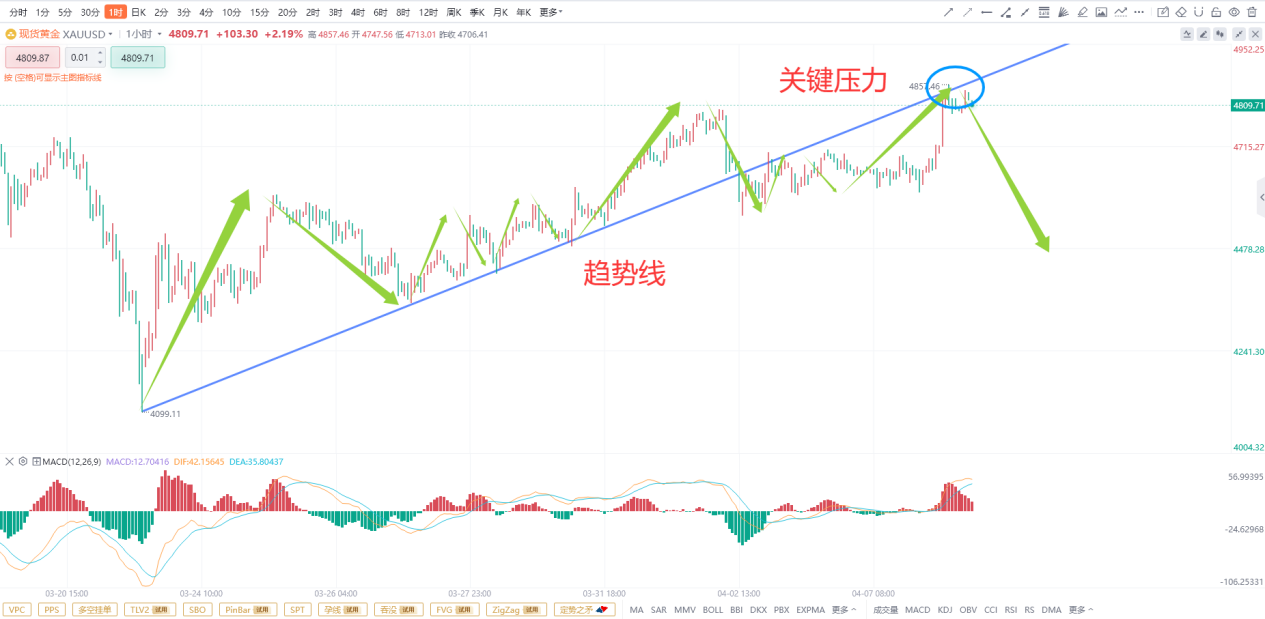 先来看1小时级别k线图,在国际现货黄金下跌至4099美金/盎司触底之后,开始了震荡上涨走势,短线呈现低点抬升高点创新高的上涨走势,但是在触及4800美金的压力之后开始了第二轮的下跌,并且打破了趋势线的支撑,后续黄金上涨多次测试顶部趋势线的压力后没有完成有效突破均开始下跌,目前k线再次来到了4857的趋势线附近,再次承压,目前还没有突破顶部的压力趋势线,所以上涨还没有开始。