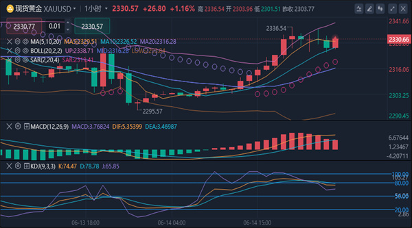 【黄金消息面分析】:在全球经济波动的大背景下,黄金作为传统的避险资产,其价格走势一直备受投资者的关注。周五(北京时间6月14日)现货黄金价格小幅走高,一度站上2330美元关口上方,截至发稿时,现货黄金小幅回落至2335.76美元/盎司,日内上涨0.96%。这一波动主要受到美国经济数据和美联储政策动向的影响。