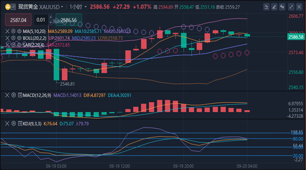 【黄金消息面分析】:在当前全球金融市场的复杂局势下,黄金价格再度成为焦点。周四(9月19日)欧洲时段,黄金价格反弹至2585美元/盎司附近。中东局势进一步紧张以及美联储大幅降息50个基点,令市场避险情绪显著提升,成为推动金价上涨的主要因素。