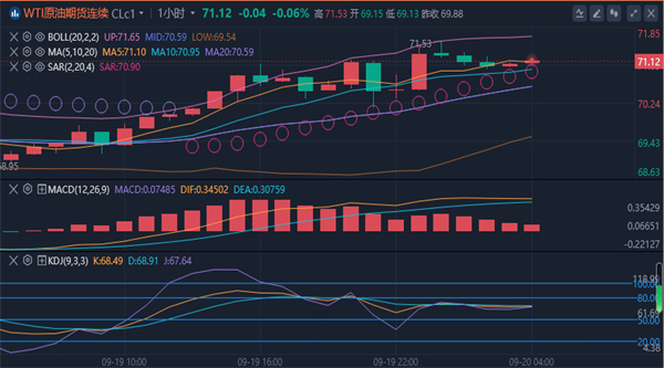 【原油消息面分析】:周四(9月19日)欧盘时段,WTI原油期货价格周四攀升。盘中报71,14美元,接近两周以来最高点。 WTI原油价格在周三小幅回调后重新获得积极的牵引力,从64.75美元一线以及上周触及的2023年5月以来的最低水平基础上回升