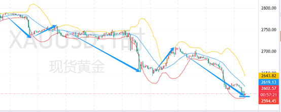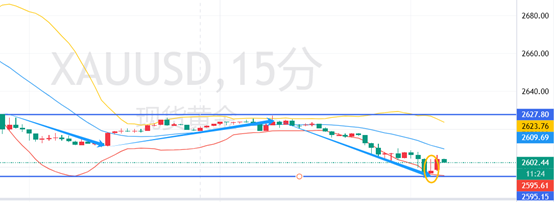 15分钟K线图,目前已经打破震荡行情,走入大跌,已经破了下方2600的大关。观察今日周期,最高在2627,最低2595。跌了30多个点.布林带开口,K烛在下轨行动。新出现一根倒锤线(黄圈标注)。那么倒锤线代表什么?长期下跌的低位出现倒锤子线,预示后市出现反弹甚至反转的几率非常大。简单来讲,倒锤子线次日若是一根实体较长的阳线,则上涨信号更强烈。结合我文中对黄金的判断:2691-85区域,在此处多单博弈。所以接下来可等区域内多单入手。