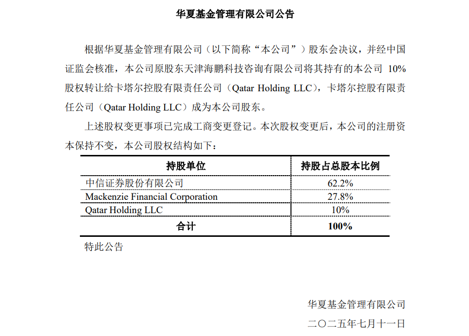 7月11日,华夏基金公告称,原股东天津海鹏科技咨询有限公司将其持有的10%股权转让给卡塔尔控股有限责任公司,交易已完成工商变更登记。此次变更后,华夏基金股权结构调整为中信证券持股62.2%、迈凯希金融持股27.8%、卡塔尔控股持股10%,三者合计持股100%。