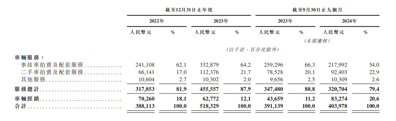 公司主营事故车拍卖及配套服务,2024年前三季度占总收入约54%,而二手车拍卖等贡献超2成收入。