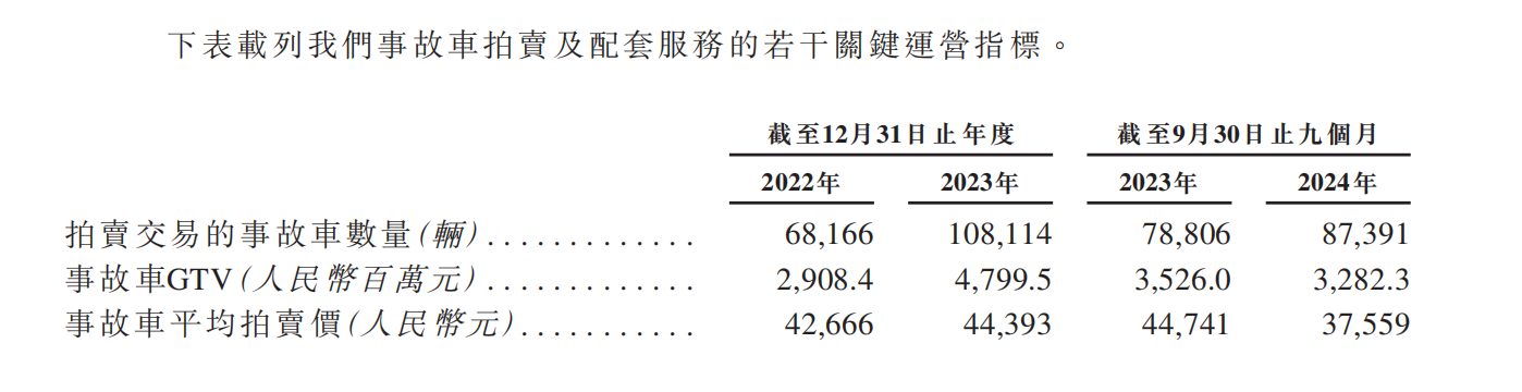 具体来看,公司事故车平均拍卖价格从2022年的42666元上升至2023年的44393元,主要由于在洪水或台风季节受损的价值较高事故车数目增加。然而2024年前三季度单车拍卖价格急剧下滑,从2023年同期的44741元下降至37559元,博车网将其归因于中国的汽车业(新能源车)的显著价格波动,导致平台上平均拍卖价格急剧下滑。