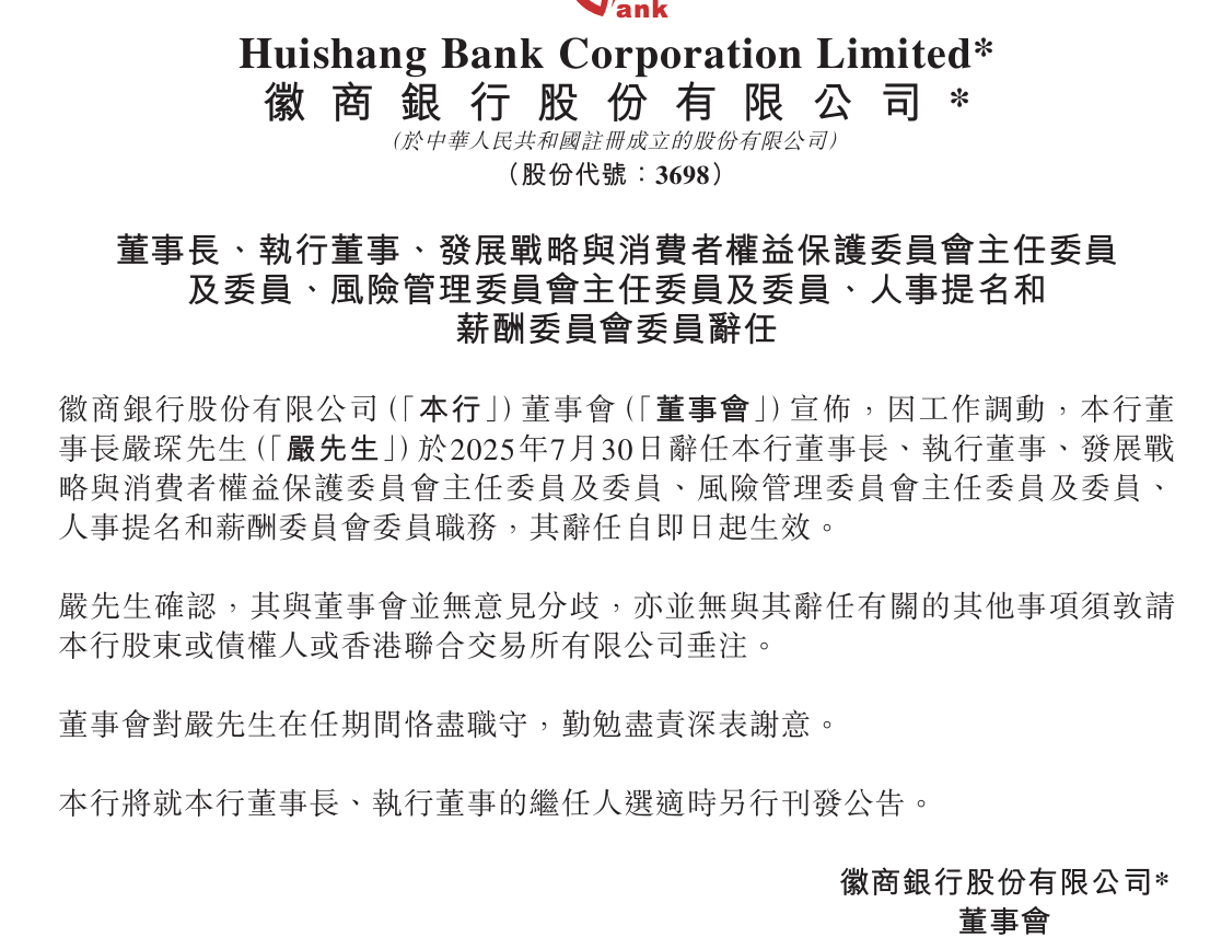 7月31日,徽商银行(03698)发布公告称,因工作调动,该行董事长严琛已辞任多项职务,相关辞任即日起生效。