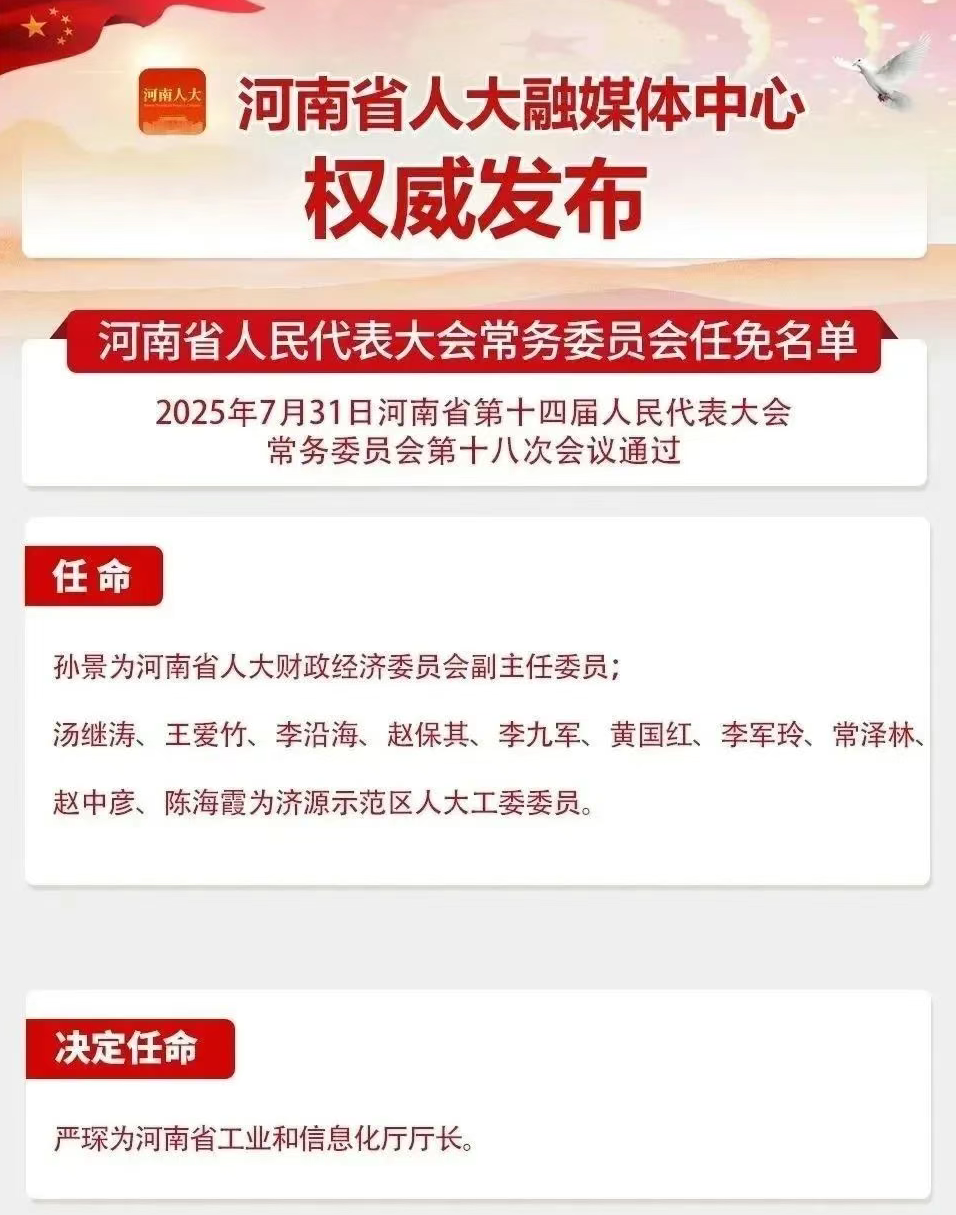 与此同时,微信公众号“河南发布”明确了其“工作调动”的具体去向——河南省十四届人大常委会第十八次会议通过任免事项,决定任命严琛为河南省工业和信息化厅厅长,严琛从银行系统直接跨省转任地方政府职务。