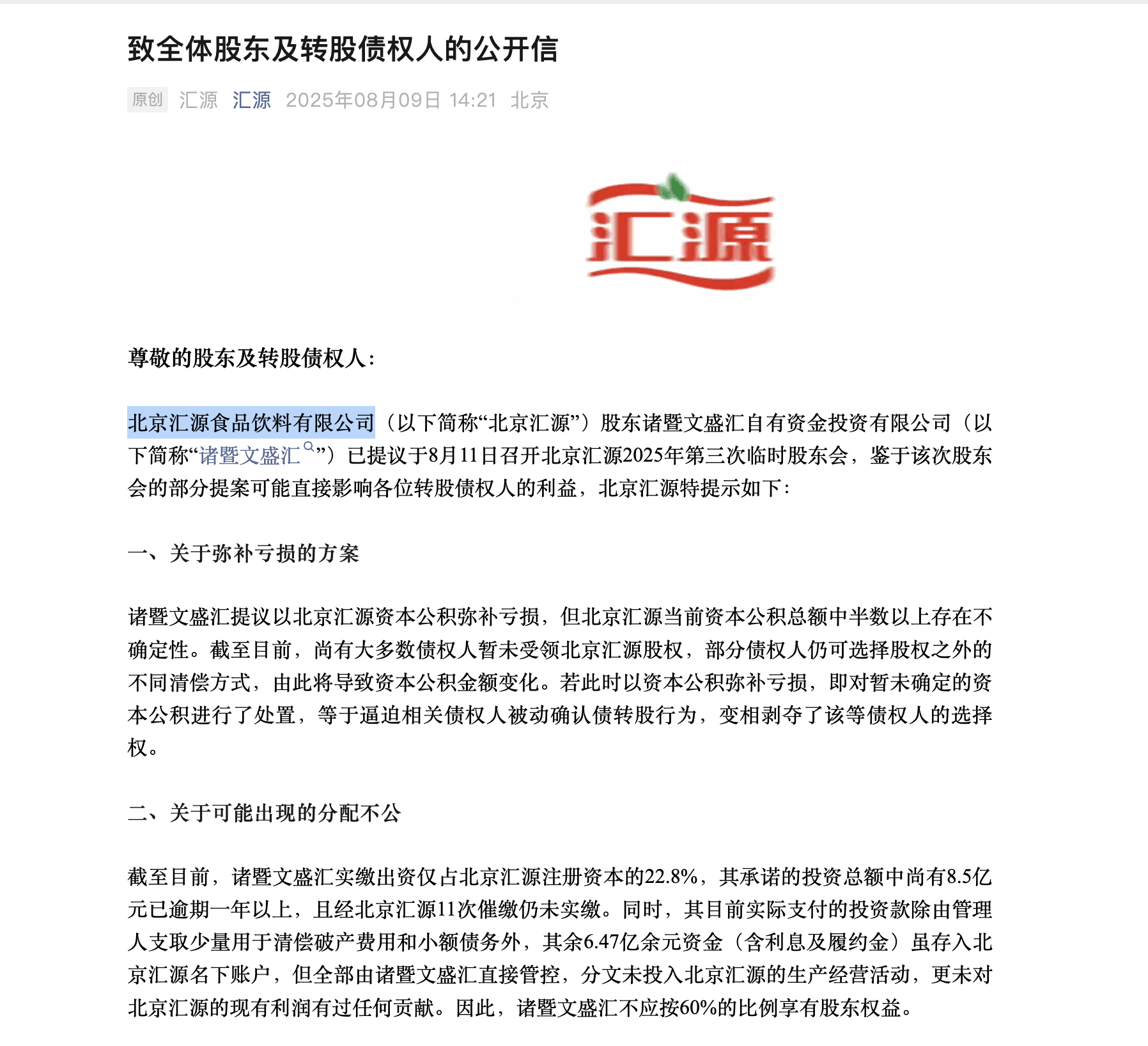 8月9日周六下午,北京汇源食品饮料有限公司(下称“汇源果汁”)官微发布一封《致全体股东及转股债权人的公开信》。