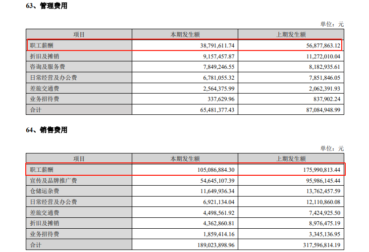 销售费用也基本如此。2025年上半年,华致酒行销售费用减少1.3亿元至1.9亿元。其中,职工薪酬减少了7090万元,是减少额的绝对主力。