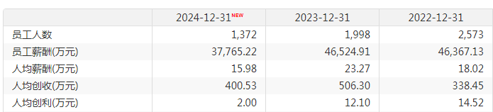 2024年末,华致酒行在职员工的数量合计1372人,与上一年相比减少了逾600人,与2022年相比的降幅接近一半。