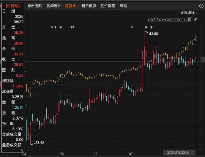 从二级市场表现来看,三维天地股价在2025年4月触及23.42元的阶段性低点,此后开启一波上升行情。截至7月14日公司披露减持公告前一日,股价一度冲高至43元,创下近期峰值。然而伴随股东减持计划的公布,股价出现回调,截至8月22日收盘,报38.61元,总市值29.86亿元。
