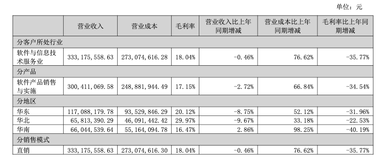 三维天地主营业务包括数智化检验检测管理、数据资产管理等应用软件产品的研发、销售及实施。软件产品销售与实施是公司最主要的收入来源,占总收入的90.17%,但其2024年营收同比下滑2.72%,毛利率仅为17.15%,同比减少34.54个百分点。
