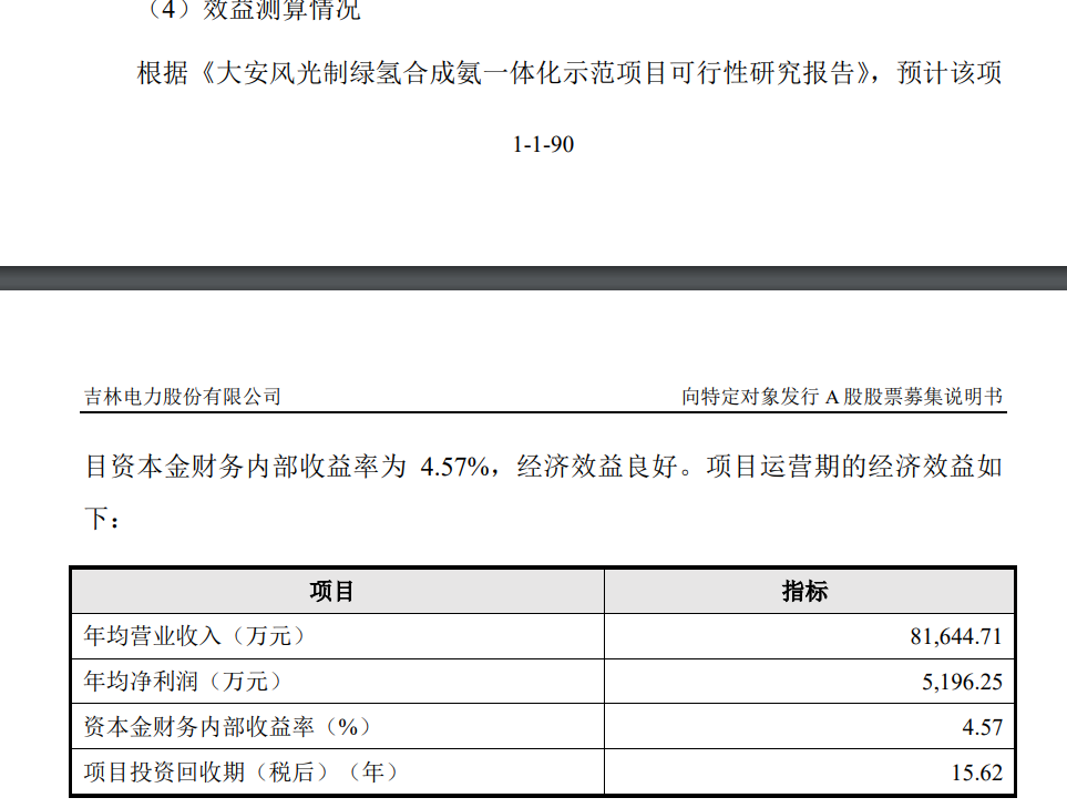 不过,吉电股份在定增时给出的项目回报期却有些长。据公告,吉电股份大安项目总投资为59.56亿元,项目达产后年均营收为8.16亿元,年均净利润为0.52亿元,项目投资回报期(税后)为15.62年。