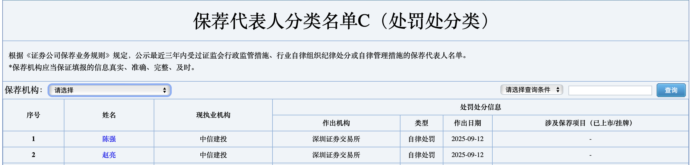 中国证券业协会官网信息显示,深交所近期对中信建投(601066)两名资深保荐代表人陈强、赵亮实施自律监管处罚,将其列入C类(处罚处分类)名单。虽然深交所并未公布对两人采取自律监管处罚的具体原因,但查找两人历史保荐项目不难发现,两人共同保荐的北京国遥新天地信息技术股份有限公司(下称“国遥股份”)创业板IPO项目在2024年6月遭到撤回,市场普遍猜测陈强、赵亮的受罚或与这一项目有关。
