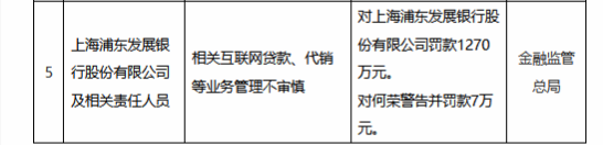 依据监管规定,金融监管总局对浦发银行处以1270万元罚款;同时,对责任人何荣给予警告处分,并处罚款7万元。