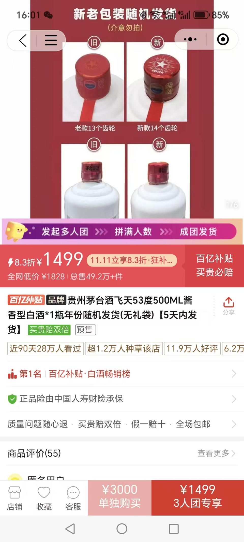 根据电商平台的信息,经过补贴后,3人团购,一瓶53度飞天茅台500Ml的价格为1499元/瓶;且活动页面显示,中国人寿财险承保产品的正品险。