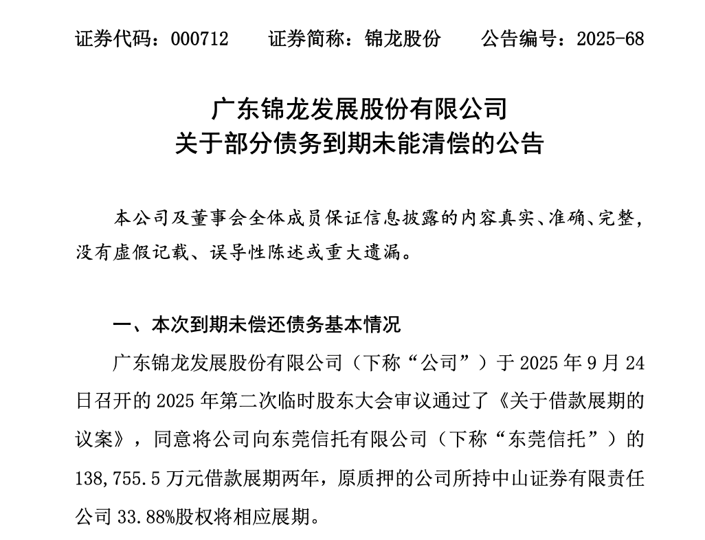 锦龙股份近年来正面临严重的债务危机,并由此引发了股权不稳定与经营不确定性。其中,公司最核心的问题源自于对东莞信托的13.71亿元借款已实质逾期,并且展期协议因为条款分歧而未能签署,同时这笔借款以其持有的中山证券33.88%股权提供质押,加上因为债务纠纷遭到司法冻结的所持中山证券、东莞证券部分股权,公司核心资产的安全性与控制权稳定性受到了较大威胁。