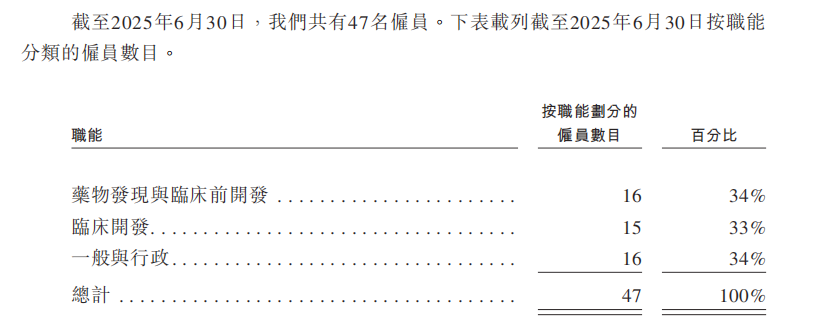 截至2025年6月30日,公司研发相关人员(药物发现与临床前开发+临床开发)共有31人,其余16人为一般与行政人员。在生物制药行业,这几乎是一个“微型”团队。按估值计算,人均价值近4700万元。