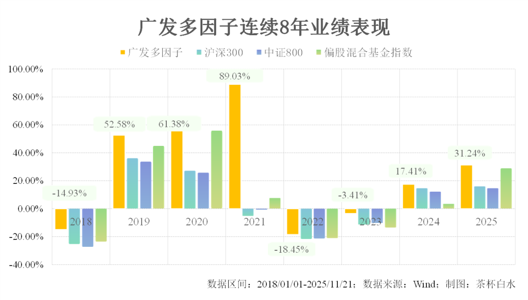 杨冬任职时间较长的广发多因子(002943),因2021年重仓周期股获得极高收益而广为人知,值得注意的是,这只产品已连续近8年战胜沪深300、中证800、偏股混合型基金等主流指数,非常适合作为基金组合中的“底仓”产品。