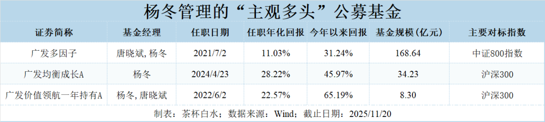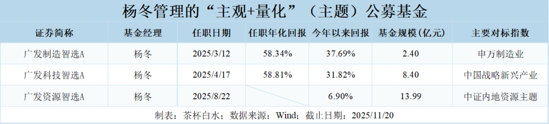具体来看,杨冬管理的策略类产品包括广发稳健策略(006780)和广发成长智选(002802),业绩基准分别主要对标中证红利和国证1000成长指数。