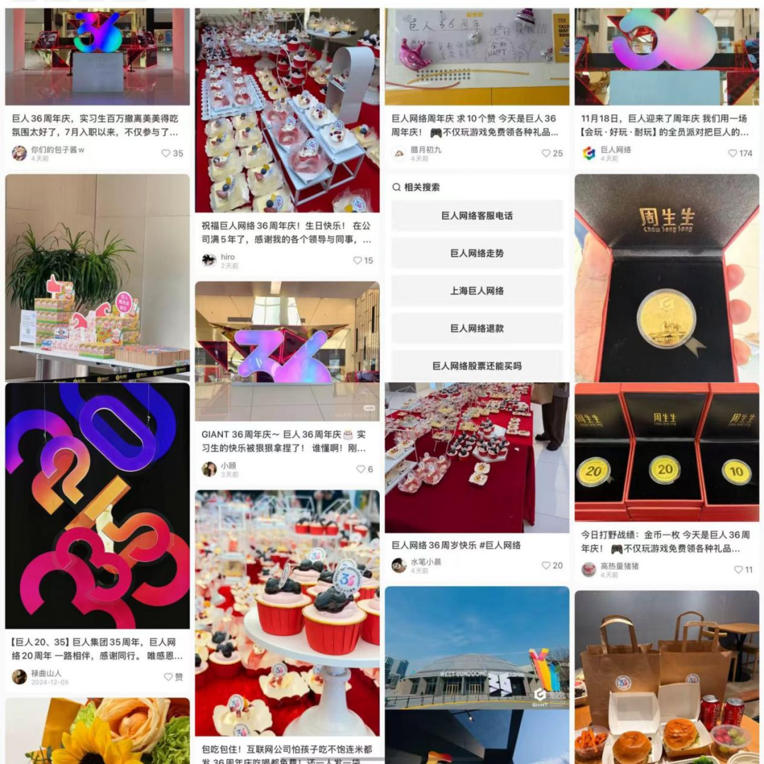 近期在小红书上搜巨人网络看到一些蛮有趣的内容。巨人刚在11月18日过公司周年庆,内部办了一个送金币活动,员工领到金币在小红书上晒,吸引大量讨论。