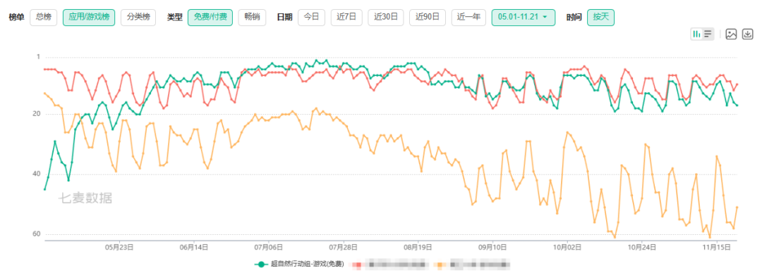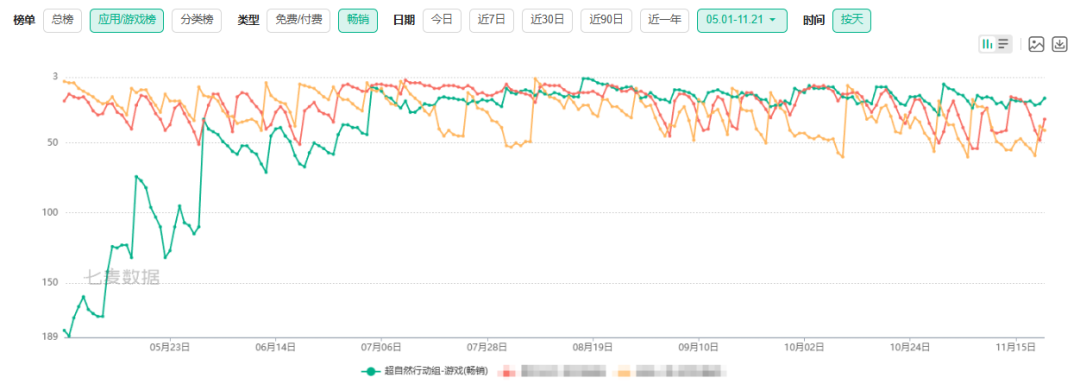 从畅销榜曲线来看,《超自然行动组》的排名在6月开始快速上升,并在7月达到新高,此后基本长期处于Top 20的水平。相比之下,某行业王牌产品则加大了波动。