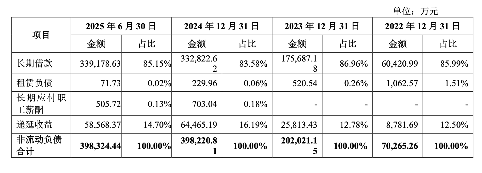 并且,《财中社》还注意到,公司的长期借款正在逐年增加,报告期各期末分别为6.04亿元、17.57亿元、33.28亿元和33.92亿元,占非流动负债的比例分别为85.99%、86.96%、83.58%和85.15%,主要为抵押及信用借款。