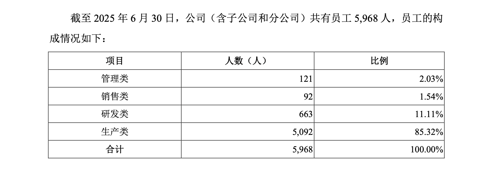 与此同时,公司研发人员占比也逐年下滑,科创属性评价标准要求公司研发人员占员工总数的比例不低于10%,但公司研发人员占比却从2022年的18.13%一路下滑到2025年上半年的11.11%,已经逼近红线。从员工构成来看,公司员工以生产类员工为主,2025年上半年高达5092人,占到85.32%,研发类员工仅有663人。对此,公司解释称,封测本身是劳动密集型行业,随着整体员工人数翻倍增长,研发占比自然会降低。
