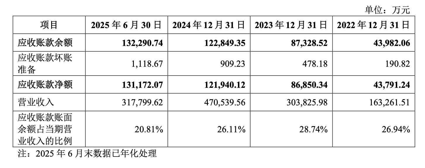 从经营模式来看,盛合晶微的客户结构高度集中。招股书披露,报告期内公司前五大客户收入占比分别为72.83%、87.97%、89.48%和90.87%,其中第一大客户的收入占比从2022年的40.56%攀升至2025年上半年的74.40%。