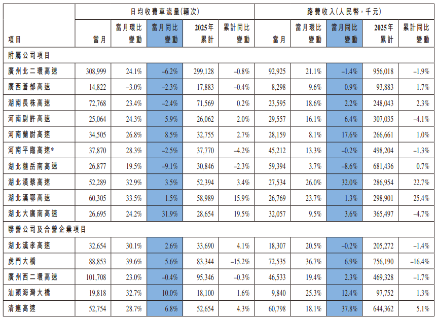 12月30日,越秀交通基建(01052)发布公告,2025年11月未经过审计的营运数据显现出多项变化。