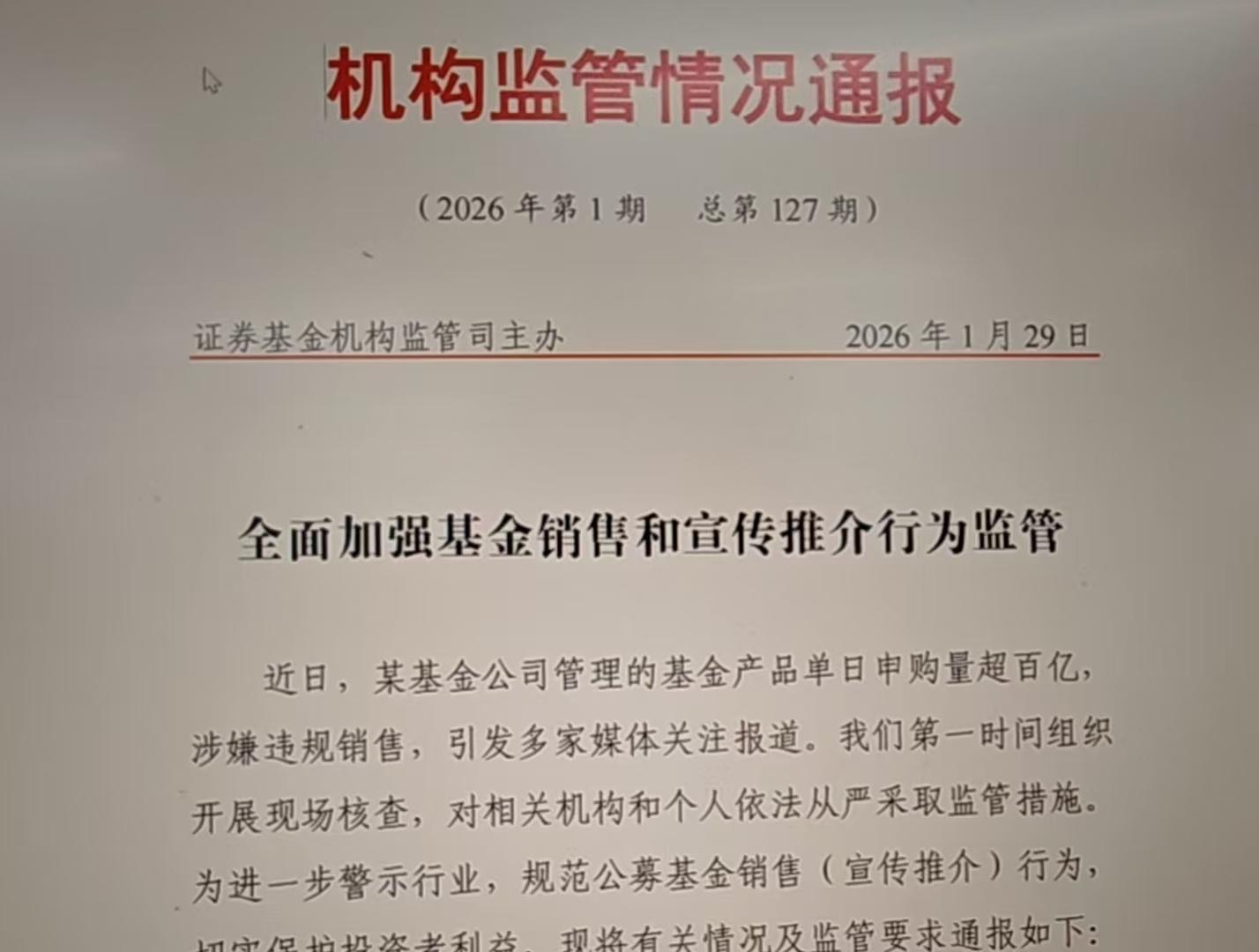 近日,多家媒体从业内获悉,证监会2026年第一期《机构监管情况通报》于1月29日发布,其中通报了一家“D基金公司”与不具备基金销售业务资格和基金从业资格的互联网“大V”开展营销合作,向其支付大额广告费,以预告大额购入基金产品为噱头,利用流量和影响力鼓动投资者跟进购买。