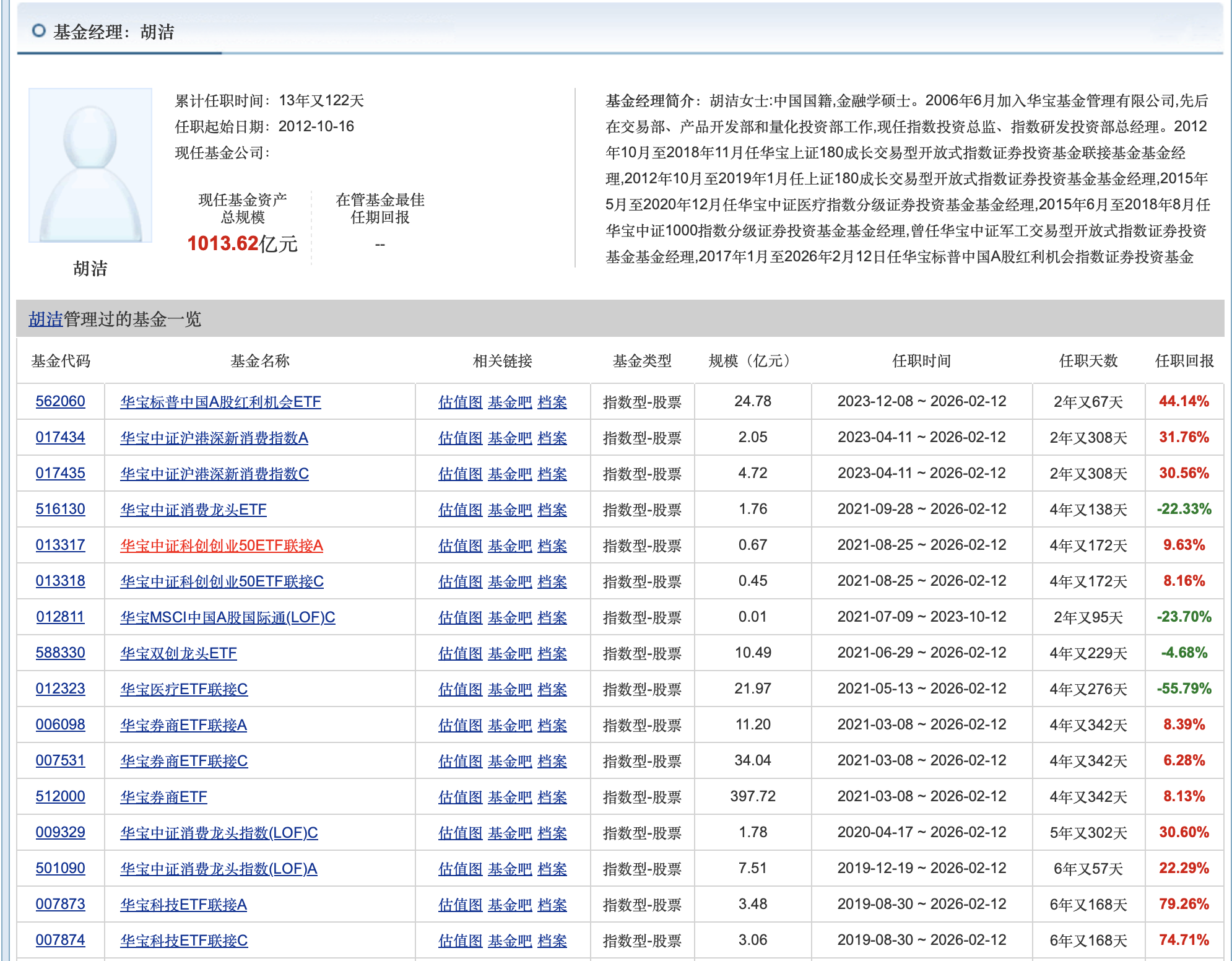 Wind数据显示,在卸任前,胡洁管理的基金数量多达16只,截至2025年四季度末,其管理规模超过1000亿元。这一规模不仅在华宝基金内部占据举足轻重的地位,在全市场的指数基金经理中也名列前茅。从标普中国A股红利机会ETF到中证科技龙头ETF,胡洁管理的产品线几乎覆盖了华宝基金指数体系的核心版图。