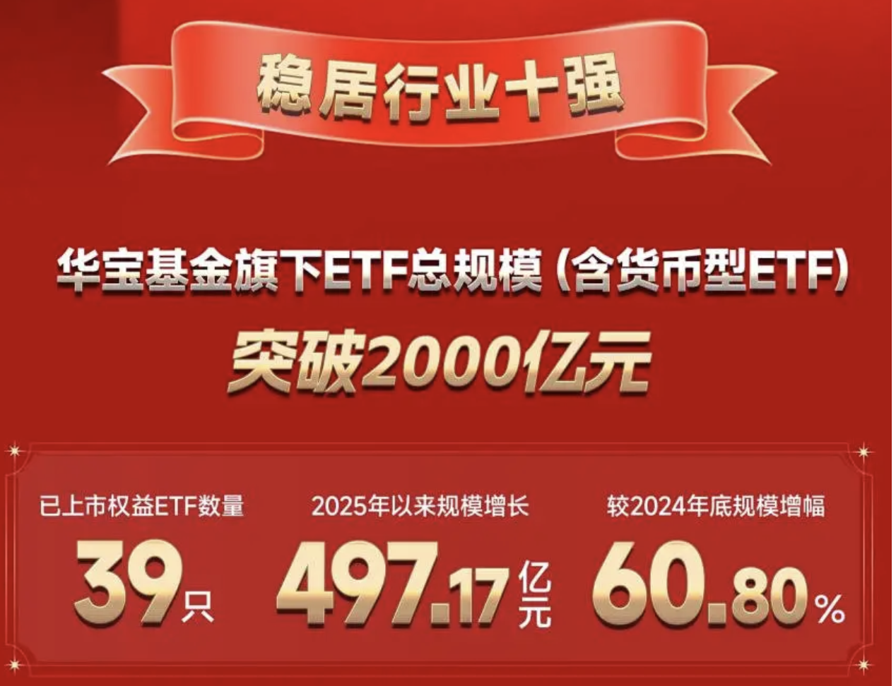 从表面数据看,华宝基金的ETF业务在2025年交出了一份堪称亮眼的成绩单。截至2025年10月末,华宝基金旗下股票型ETF管理规模较2024年末激增60.80%,达到1314.94亿元,带动其ETF总规模(含货币型ETF)一举升破2000亿元大关,稳居行业前十,当年前三季度,其股票ETF合计实现利润高达162.61亿元,赚钱效应显著。