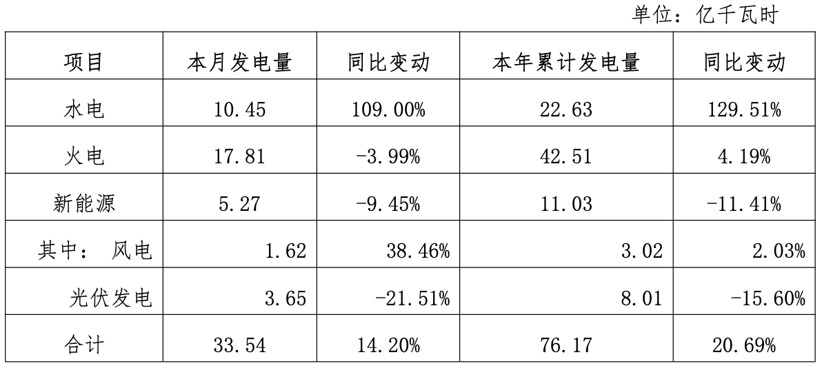 湖北能源:2月发电量同比增14.20%,水电发电量显著增长达109%