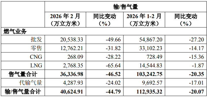 在输/售气量方面,2026年2月完成量为40624.91万立方米,同比减少44.79%。