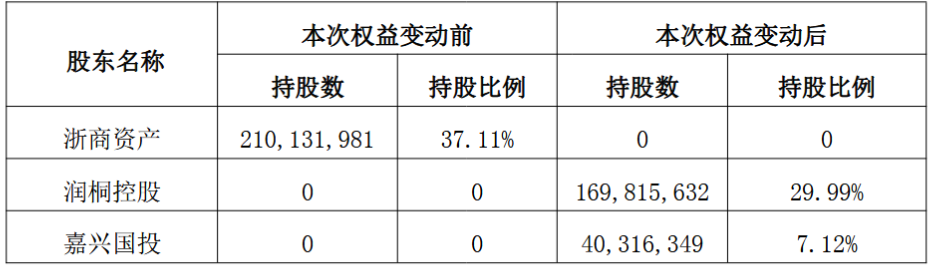 同时,浙商资产向嘉兴国投转让其所持有的4032万股,每股转让价格为7.55元,股份转让价款总额为3.04亿元,约占公司总股本的7.21%。综上,控股股东浙商资产拟将其持有的2.1亿股转让给润桐控股和嘉兴国投,约占公司总股本的37.1101%。本次权益变动完成后,交易各方持有上市公司股份的情况如下表所示: