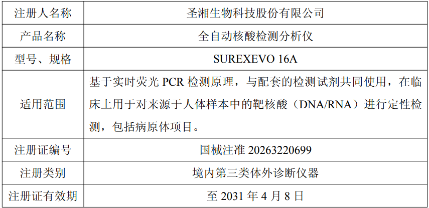 此次注册的全自动核酸检测分析仪是公司在体外诊断及即时检验领域的重要研发成果,具备高度集成、全自动操作、检测快速准确等特点,能够有效满足快速、精准核酸检测的需求。